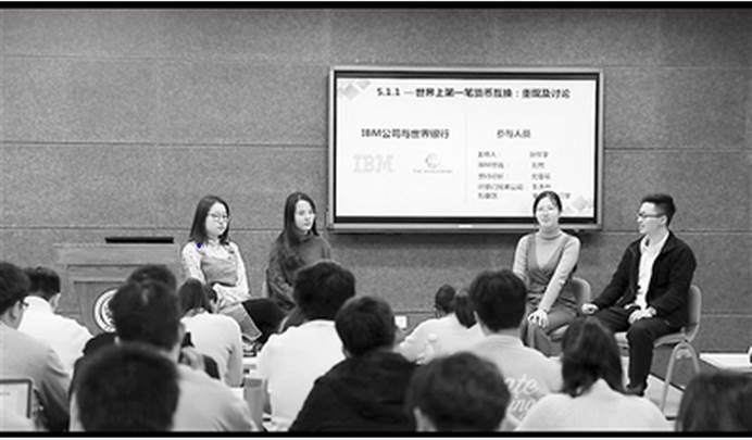 太阳成集团tyc122cc本科生金融工程概论课程“翻转课堂”活动——员工在重现世界上第一笔货币互换的案例。