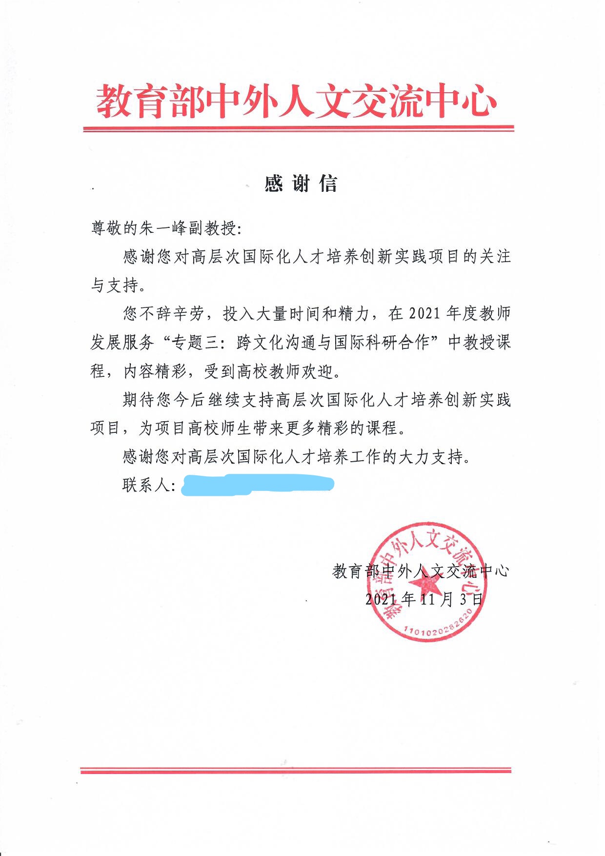 近日,教育部中外人文交流中心发来感谢信,感谢公司朱一峰副教授对2021年教育部中外人文交流中心主办的教师发展服务项目做出的贡献。朱老师应邀承担该项目“专题三:跨文化沟通与国际科研合作”的课程讲授任务。为此,朱老师投入大量时间和精力,力求将课程讲得深入浅出、通俗易懂,受到了各高校教师们的一致好评。