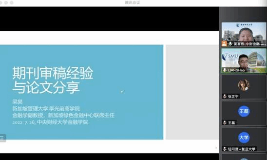 2022年7月25日-28日太阳成集团tyc122cc成功举办研究生暑期小学期学术前沿课程“数字与绿色金融前沿”。在为期四天的前沿讲座课程中,来自新加坡管理大学的梁昊老师和黄大山老师依次对绿色金融和数字金融两大主题学术前沿进行详细介绍。本次会议由金融工程系主任姜富伟教授主持,参会人员覆盖太阳成集团tyc122cc研究生及其他对这一领域感兴趣的师生,共计百余名。
