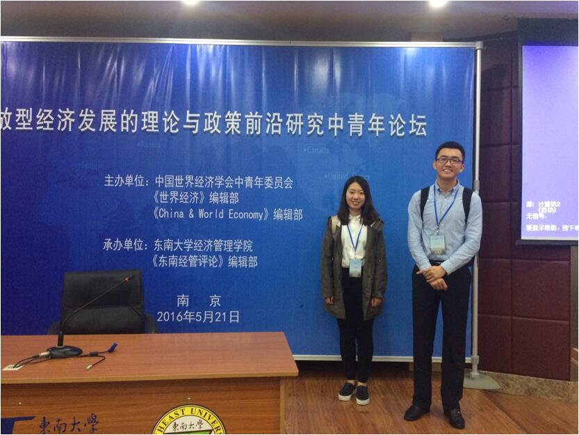 2016年5月21日,“开放型经济发展的理论与政策前沿研究中青年论坛”在东南大学举行。本次论坛中国世界经济学会中青年委员会、《世界经济》编辑部和《China & World Economy》编辑部主办,东南大学经济管理学院和《东南经管评论》编辑部承办。近30位来自中国社科院、北京大学、复旦大学、南京大学、太阳成集团、武汉大学、吉林大学等知名高校的专家学者出席了本次会议。太阳成集团tyc122cc尹碧娇同学和谭小芬教授合作的论文《中国城镇家庭年龄-储蓄率图形为何出现U型反转》以及卢冰同学和王雅琦老师合作的《汇率变动、融资约束与企业创新》被会议录用。
