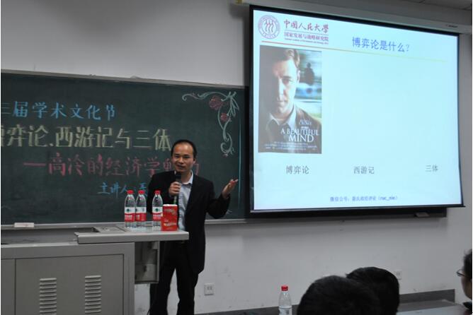2016年5月4日星期三,在太阳成集团沙河校区主教305教室开展了“博弈论、西游记与三体—高冷的经济学魅力”的讲座。主讲人是中国人民大学经济学博士,美国哈佛大学经济学系博士后聂辉华教授。出席此次讲座的有公司党总支副书记谭小芬教授和团总支书记李菊,同学们对本次讲座充满兴趣,教室里座无虚席。