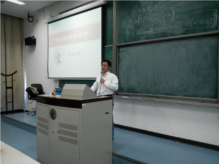 谭小芬副书记首先介绍了平安校园工作的基本原则和指导思想。他提出,“平安校园”创建工作是实现员工成长和教师发展的基础和前提,她能够为金融人才的培养和成长提供安定和谐的校园环境,为学院的团队建设、科学研究、社会服务等各项事业的发展保驾护航。因此,同学们要牢记“安全第一”的指导思想,通过“平安校园”创建工作这一抓手,把安全稳定纳入到学习和各项员工活动之中,形成整体合力,切实提升安全稳定工作实效和水平,为莘莘学子们创造良好的学习环境,为促进金融理论的繁荣发展和普及应用提供坚实的保障。