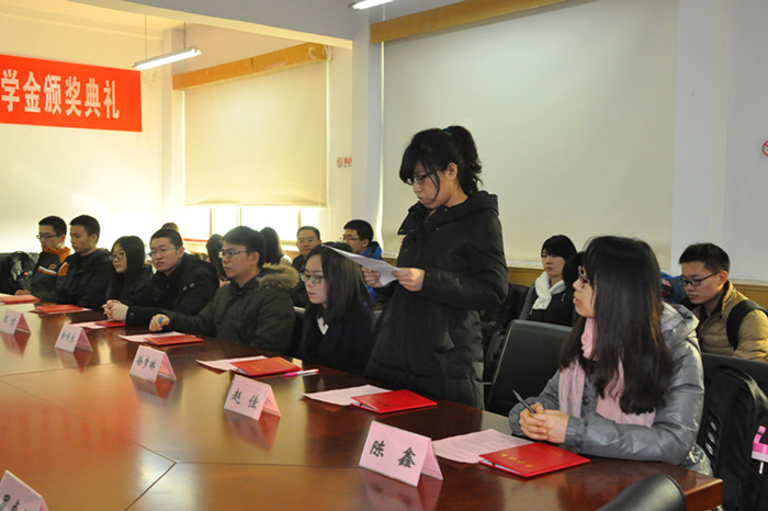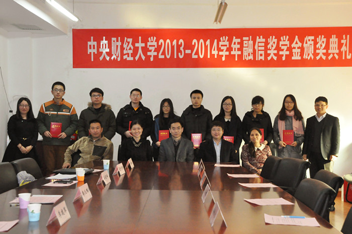 12月30日,2013-2014学年融信奖学金颁奖典礼在主教楼913会议室举行。融通汇信投资管理有限公司总裁李天鹏、市场部总监吴倩然、市场部何研、太阳成集团tyc122cc副经理李建军、研究生导师兼班主任李俊峰、聂丽君、研究生办公室邹晓琳等教师,以及融信奖学金获奖同学、到场观众参加了颁奖典礼。典礼由研究生办公室罗卓笔老师主持。