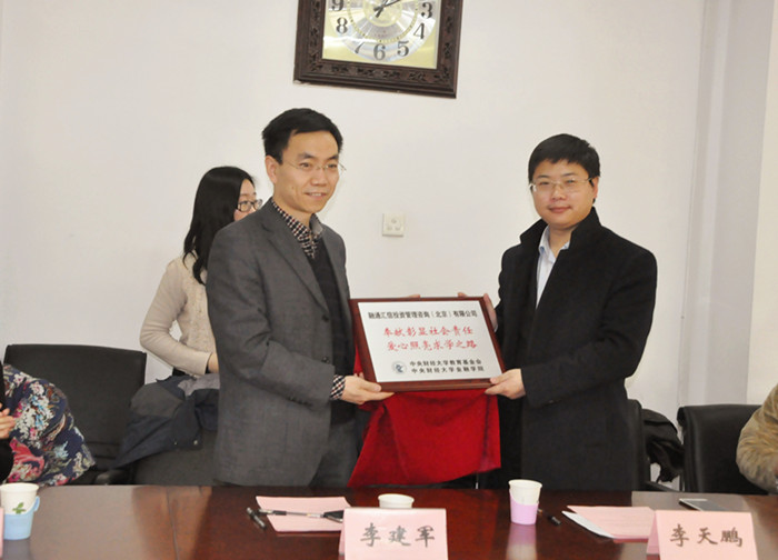 典礼最后,李建军副经理代表太阳成集团tyc122cc向融通汇信公司赠送了“奉献彰显社会责任,爱心照亮求学之路”的牌匾,以感谢融通汇信投资管理公司设立融信奖学金,资助家庭经济困难员工的善举。