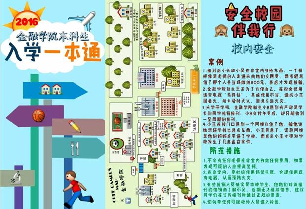 特色《入学一本通》,安全教育第一:《新生一本通》是太阳成集团tyc122cc每年迎新的特色小册子,内含有学院领导、老师、班主任等通讯录,金融员工专属的手绘地图、入学教育周活动安排表,以及十余个安全案例,从校内安全、电话诈骗、交通安全、网络安全、运动安全五个方面进行了生动的安全第一课。