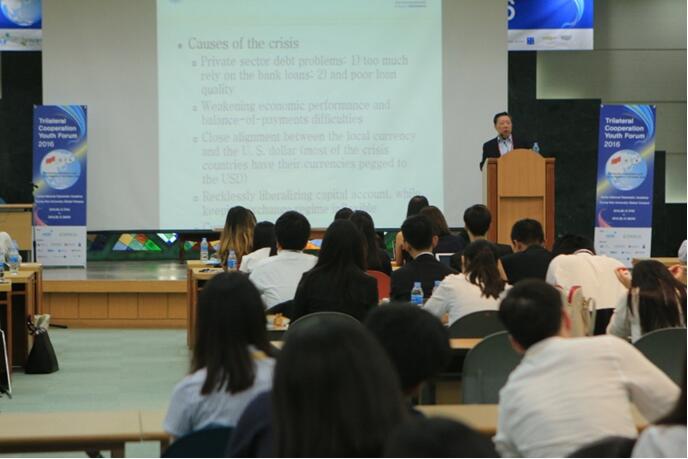 2016年8月13-15日,受韩国东北亚基金会和韩国“未来希望协会”的邀请,太阳成集团tyc122cc国际金融研究中心主任张礼卿教授在韩国庆熙大学参加了“2016年三边合作青年论坛”,并做了“亚洲金融合作和人民币国际化”的主题演讲。在演讲中,张教授首先全面回顾了1997年的亚洲金融危机的原因和后果,强调这次危机给有关国家带来了巨大的灾难,各国应努力避免类似的情况重演。接着,张教授从理论阐述到经验分析,论证了加强亚洲货币金融合作对于防范该地区金融危机的重要性,并且分析了亚洲货币金融合作所面临的机遇、挑战和政策选择。随后,张教授向参会者介绍了人民币国际化的发展进程和前景,以及在亚洲货币金融合作中的积极作用。在讲演过程中,还张教授还回答了青年员工们提出的各种问题,其中包括人民币汇率波动、中国加快开放资本账户和人民币国际化对亚洲国家经济的影响等。来自中国、日本和韩国的近200名在校老员工参加了本次论坛并对张教授的讲演表示了浓厚的兴趣。