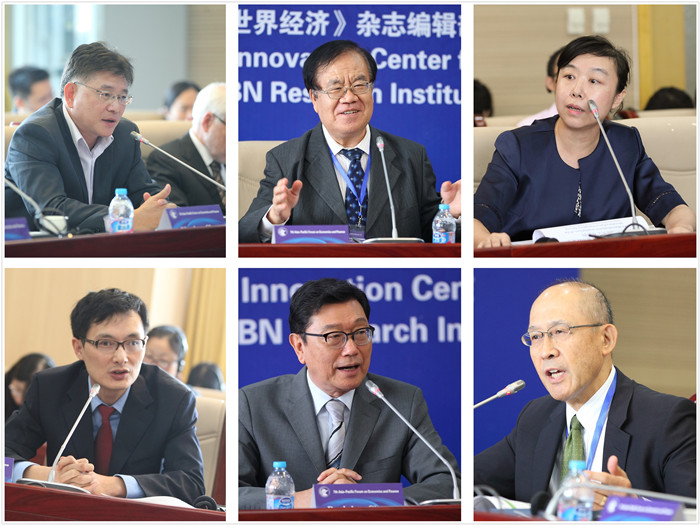 (上左:丁剑平,上中:Chalongphob Sussangkarn,上右:黄志刚,下左:Yunjong Wang,下中:Ulrich Volz,下右:谭小芬)