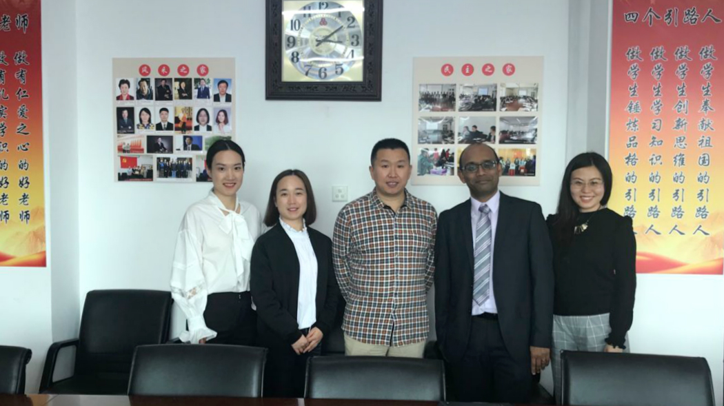 从右至左依次为:Joanna女士、Teerooven Soobaroyen教授、李俊峰副教授、黄丹老师、刘冰茹老师