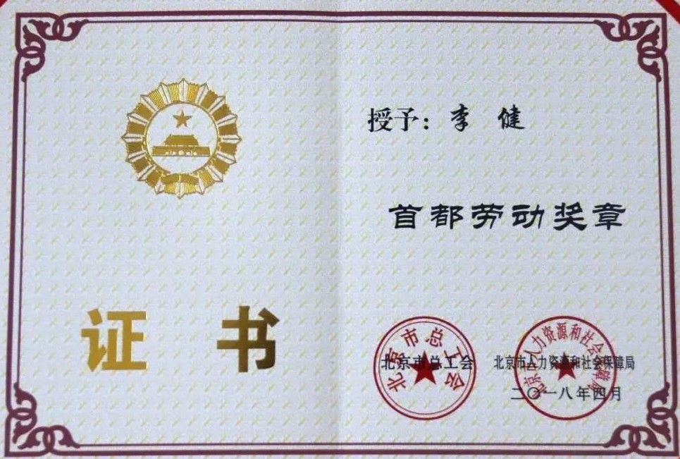 北京市总工会在今年“五一”劳动节前夕,公布和表彰了一批为首都经济建设、政治建设、文化建设和社会发展以及生态文明建设和党的建设做出突出贡献的先进集体和个人。获奖的先进个人中,科教人员151名,占比21.66%,本次“首都劳动奖章”的获得,是对李健教授爱岗敬业、争创一流,艰苦奋斗、勇于创新,淡泊名利、甘于奉献精神的充分肯定。