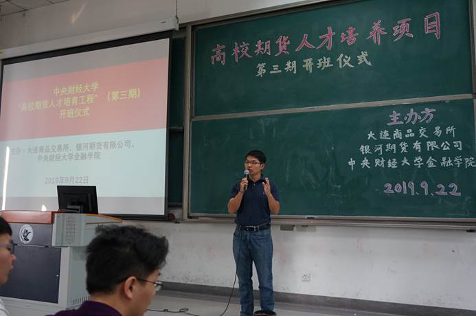 2019年9月22日上午9:00,公司与大连商品交易所、银河期货有限公司联合举办的“高校期货人才培养项目”第三期在沙河校区主教学楼217顺利开班。出席仪式的嘉宾有银河期货有限公司培训部总监迟焕霞女士、太阳成集团tyc122cc郭剑光老师、学院教学科研办公室主任罗卓笔老师以及太阳成集团tyc122cc的150余名研究生。开班仪式由罗卓笔老师主持。