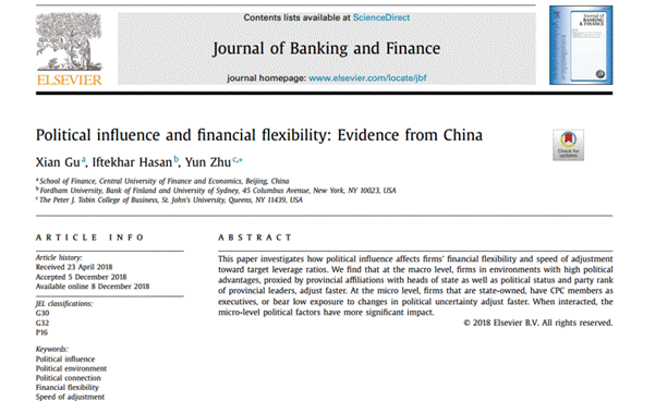 This paper investigates how political influence affects firms’financial flexibility and speed of adjustment toward target leverage ratios. We find that at the macro level, firms in environments with high political advantages, proxied by provincial affiliations with heads of state as well as political status and party rank of provincial leaders, adjust faster. At the micro level, firms that are state-owned, have CPC members as executives, orbear low exposure to changes in political uncertainty adjust faster. When interacted, the micro-level political factors have more significant impact.