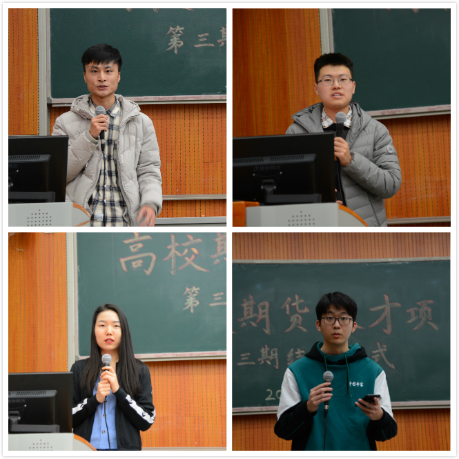 接着,罗卓笔老师宣读了本期项目的奖学金学员、优秀学员和交易优胜奖学员名单,并和迟焕霞女士一起为获奖的同学们颁发了证书。颁奖结束,罗老师邀请了获奖代表上台作学习心得和操作经验的交流。李晓程、汤菀凌、吴逸冰、陈经华四位同学分别介绍了学习经验和交易策略。
