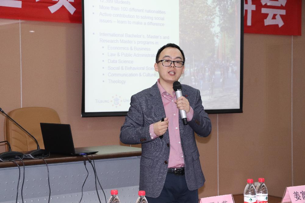 付俊伟副教授对蒂尔堡市和蒂尔堡大学的基本情况作了详细介绍。他提到,蒂尔堡大学由6个学院组成,有来自100多个国家的12399名员工在这里学习。根据2017 年 US News 全球大学排名,蒂尔堡大学的经济学与商科位列全球第 18 位。根据2017 年泰晤士高等教育(THE)世界大学专业排名中,蒂尔堡大学经济学与商科位列全球第 21 位。为了让大家进一步了解蒂尔堡大学,付老师还和大家分享了蒂尔堡大学的宣传片和宣传册。