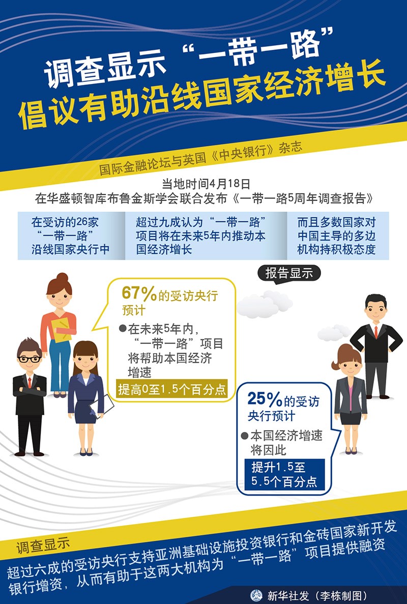 6. 2018年4月18日,国际金融论坛与英国《中央银行》杂志在华盛顿智库布鲁金斯学会联合发布《一带一路5周年调查报告》。报告显示,67%的受访央行预计,在未来5年内,“一带一路”项目将帮助本国经济增速提高0至1.5个百分点;25%的受访央行预计,本国经济增速将因此提升1.5至5.5个百分点。