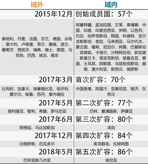 从2016年1月亚投行成立时有57个成员签署亚投行协议加入至今,亚投行已于2017年3月、5月、6月、12月批准了27个意向成员加入。亚投行表示,今后继续欢迎新的成员加入。